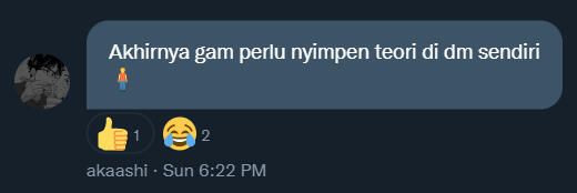 ─ Atsumu, @foxiesetterBagian ini digunakan untuk mencatat teori-teori maupun pertanyaan yang para anggota Haikyo pikirkan untuk memprediksi kelanjutan SL maupun detil masa lalu dari SL Haikyo. Mana mungkin kami membiarkan anggota seperti yang terpampang di bawah ini tidak memiliki tempat untuk berbagi teori?